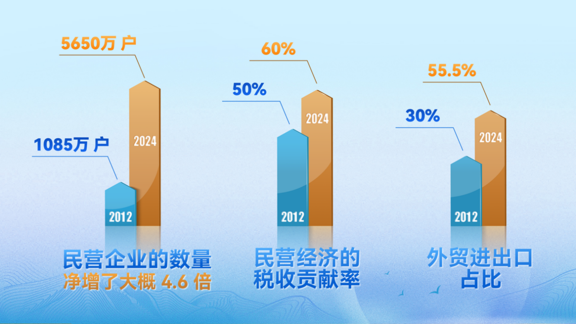 2012年到2024年,民营企业数量从1085万户增至5650万户,净增约4.6倍,年均净增长400万户。民营经济税收贡献率从50%提升至60%,外贸进出口占比也从30%提升至55.5%。