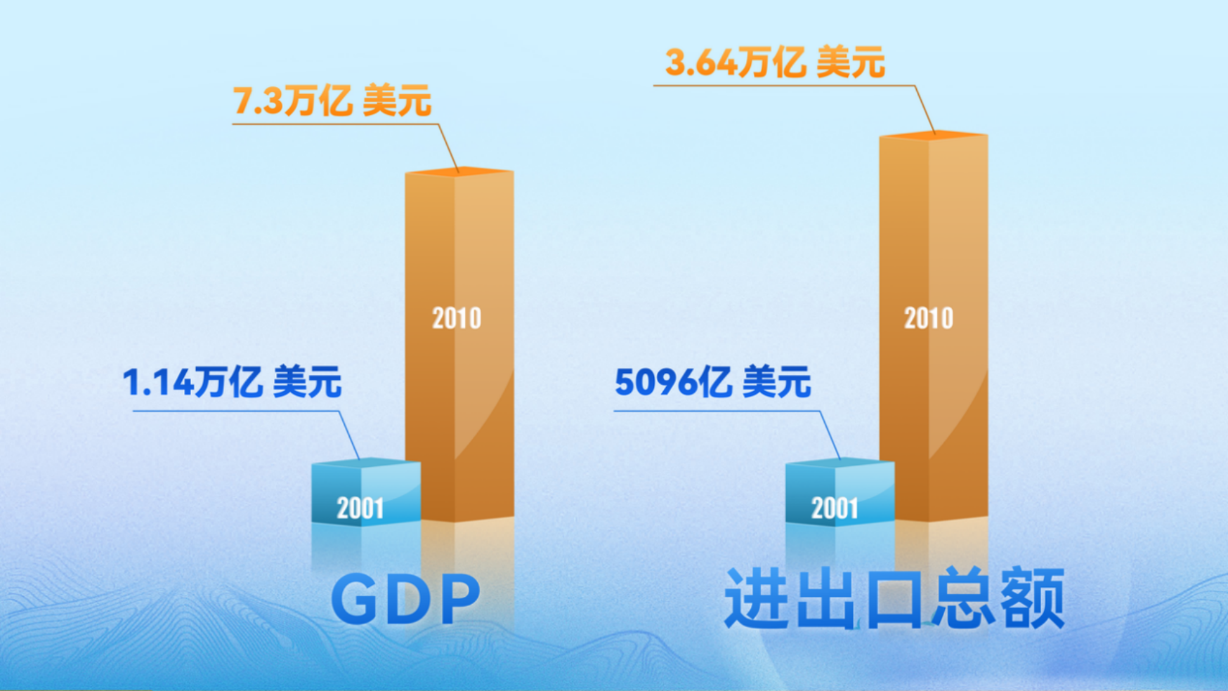 2001年中国入世,到2011年十年间,中国GDP从1.14万亿美元飙升至7.3万亿美元,年均增速超10%。进出口总额也从5096亿美元增至3.64万亿美元。