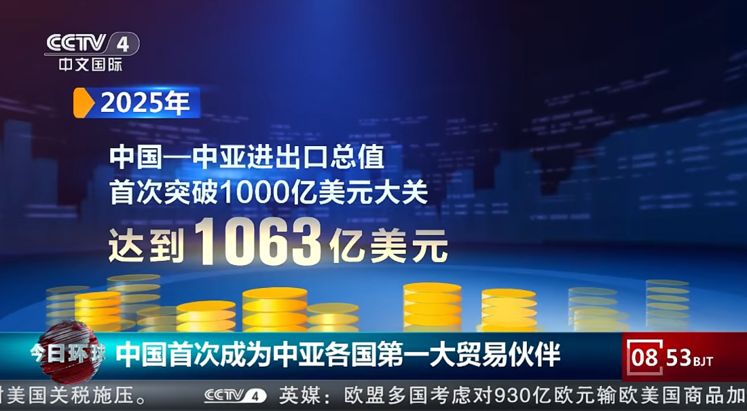 1月19日,外交部发言人在例行记者会上表示,2025年中国同中亚五国贸易额首次突破1000亿美元,在当前全球经济增长乏力、国际贸易体系遭受严重冲击背景下,中国中亚经贸合作逆势前行,印证了中国-中亚机制的引领推动作用。